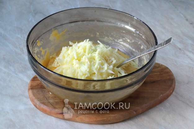 Яблоки помойте, почистите, удалите семенную коробочку, а мякоть натрите на тёрке со средними ячейками. Получившуюся стружку добавьте в миску с тестом и перемешайте.