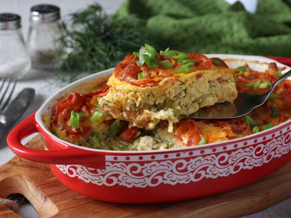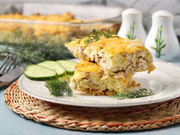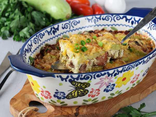 На стол приготовленную на сковороде запеканку из кабачков с курицей подают в горячем виде, но и в холодном она не менее вкусная.