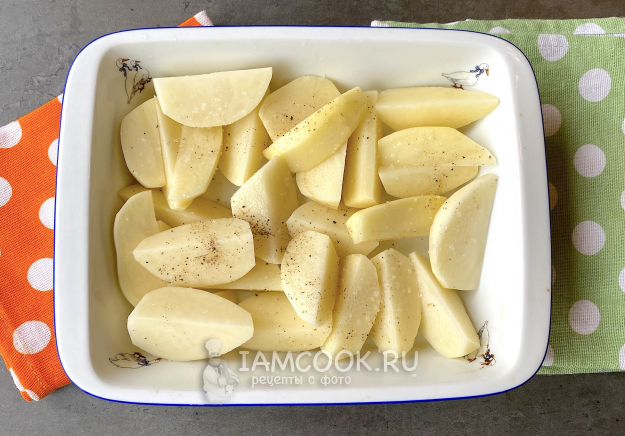 Картофель промойте, очистите и нарежьте на дольки, или как больше нравится. Выложите в форму, в которой будете запекать, посолите, поперчите и перемешайте, чтобы специи равномерно распределились.