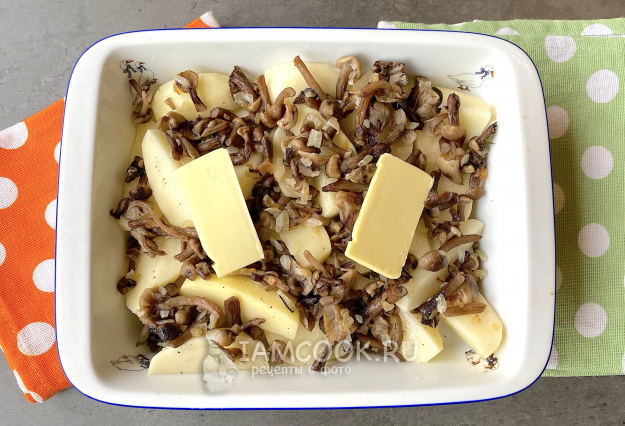 Сверху выложите опята и сливочное масло. Закройте фольгой и поставьте в разогретую до 190 градусов духовку минут на 50. Если картофель нарезан тонко, времени для запекания понадобится меньше.