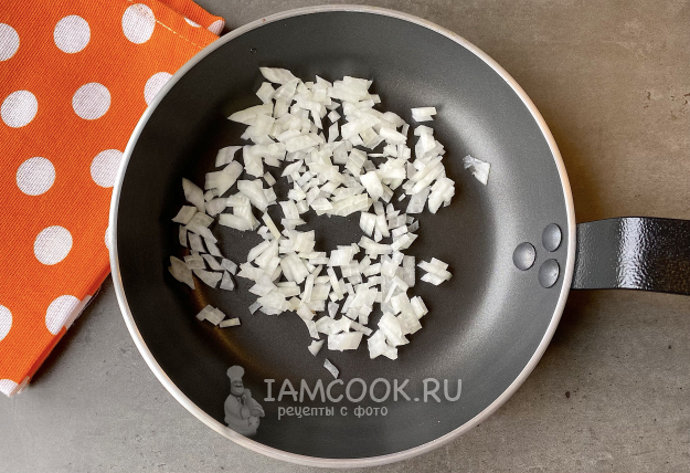 Лук очистите и нарежьте на маленькие кусочки, выложите в разогретую с растительным маслом сковороду и обжарьте до мягкости.