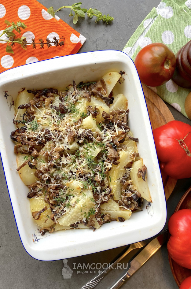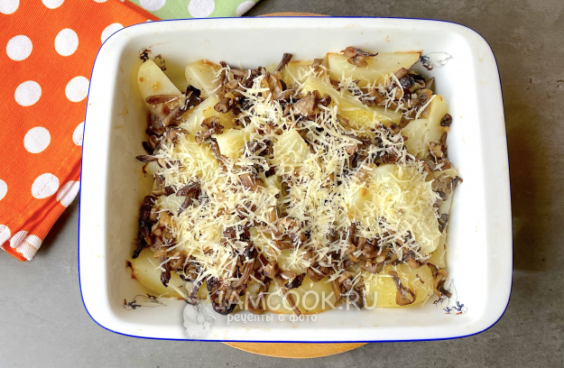 Как только достанете картошку с опятами из духовки, сразу посыпьте сыром и подайте на стол.