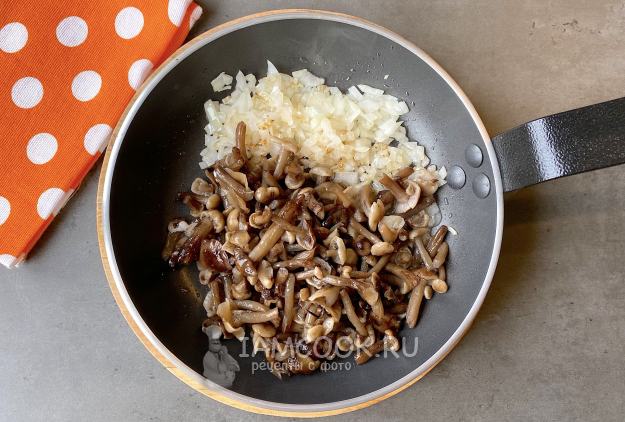 Затем выложите размороженные опята без жидкости, посолите по вкусу и обжарьте на среднем огне около 10 минут, при этом помешивайте.