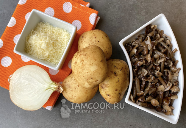 Возьмите все нужные продукты и приступайте к приготовлению картошки с опятами в духовке.
