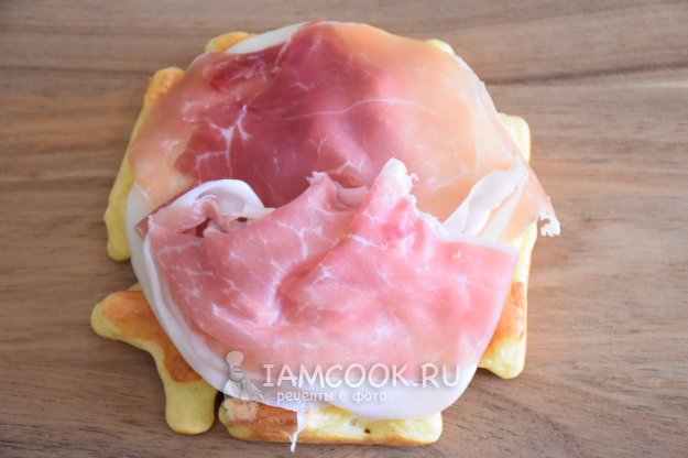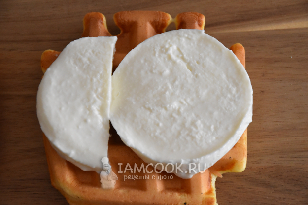 Для следующего сэндвича на вафлю выложить ломтики моцареллы.