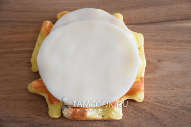 Теперь собираем сэндвич. На вафлю выложить ломтики сыра.