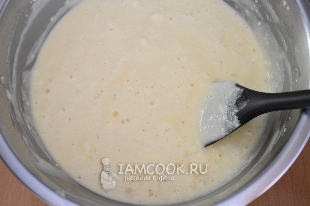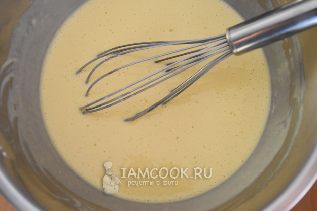 Соединить желтки, растительное масло, молоко, муку с разрыхлителем и перемешать венчиком до объединения.