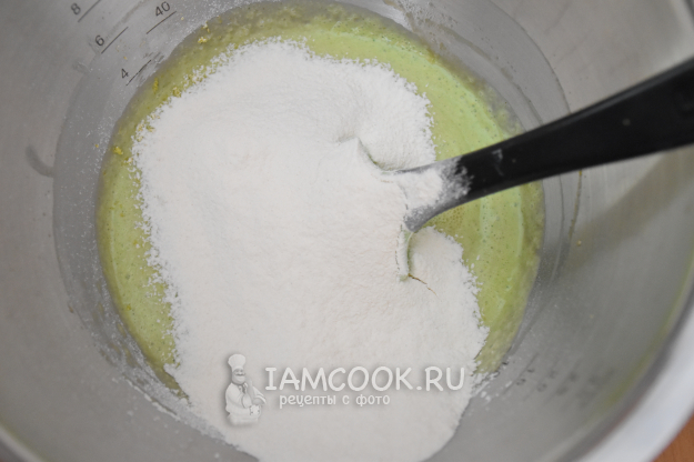 Муку просеять с разрыхлителем, добавить щепотку соли, цедру лимона и перемешать. В несколько приемов ввести мучную смесь в яично-сливочную массу.