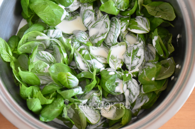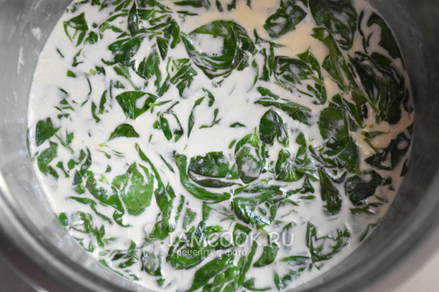 Листья выложить в сотейник, влить 100 мл сливок и поставить на слабый огонь.