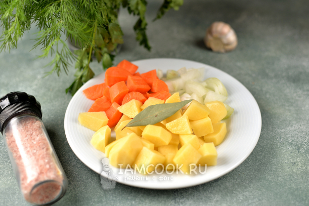 Картофель, лук и морковь нарежьте кубиком, промойте.