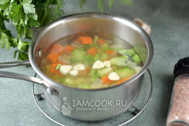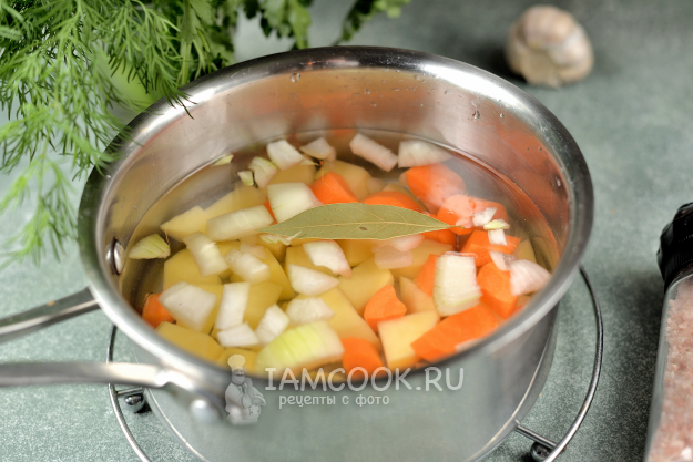 Переложите овощи в сотейник или кастрюлю, залейте чистой питьевой водой, сразу же положите лавровый лист. Варите овощи на умеренном огне 15 минут.