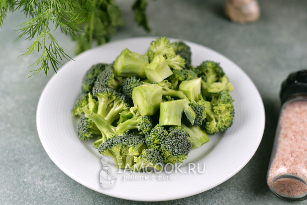 А пока разберите брокколи на соцветия, стебель также нарежьте кусочками.