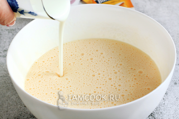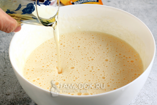 В получившуюся массу влейте растительное масло и еще раз взбейте до объединения. Масло придает яйцам еще большую пышность.