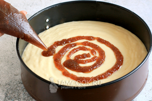 Если джем жидковат, то можно им наполнить корнетик и добавить в тесто, как на фото - выдавливая его по спирали. Или с помощью чайной ложки распределить джем в тесте хаотично.