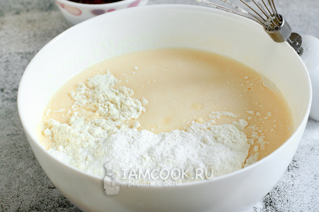 Добавьте муку с разрыхлителем и ванилином. Размешайте ручным венчиком до получения гладкого теста, миксер больше не используем.