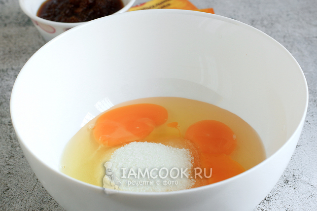 Яйца взбейте с сахаром до увеличения массы в несколько раз и до побеления смеси.