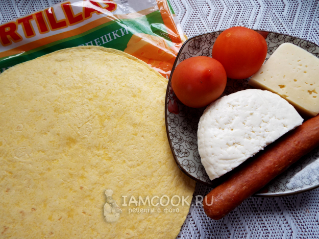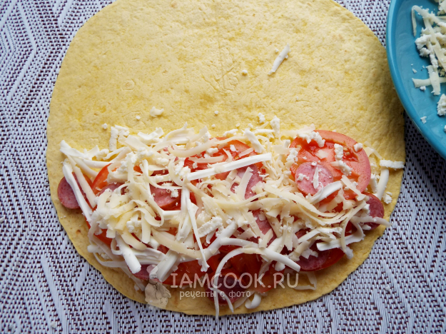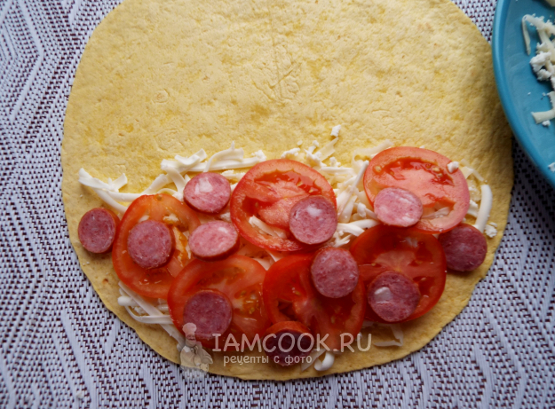 Можно взять копченую колбасу или ветчину. Если любите, можно смазать лепешку любимым соусом.