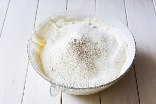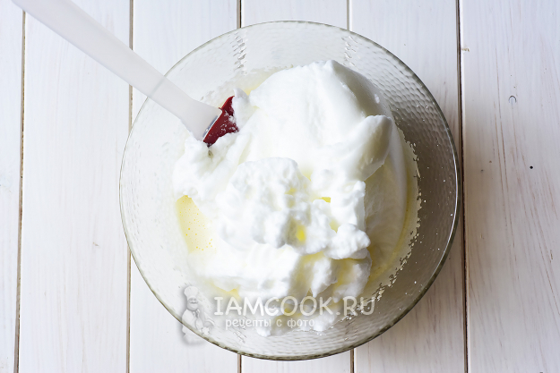 Теперь в миску к желтковой смеси выложим лопаткой взбитые белки.