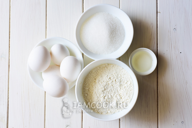 Возьмём необходимые ингредиенты для приготовления бисквитных вафель в электровафельнице.
