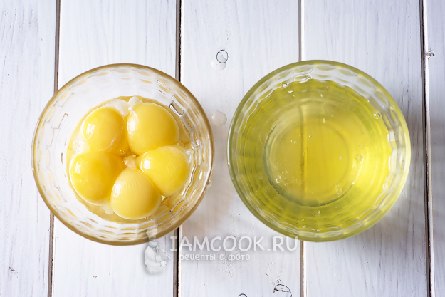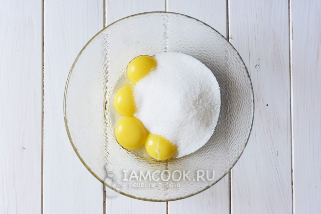 В отдельную миску выкладываем желтки и добавляем сахар.