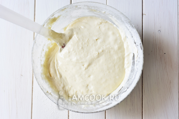 И опять очень аккуратно вмешаем муку в яичную смесь. В итоге у нас получается очень воздушное и легкое тесто.