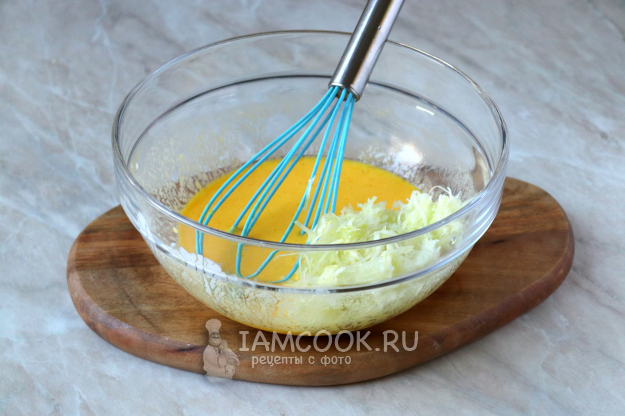 Кабачок помойте, если у него твёрдая кожица - удалите её, а мякоть натрите на тёрке со средними ячейками. Лишнюю жидкость отожмите. Кабачковую стружку переложите в миску с яично-кефирной основой.