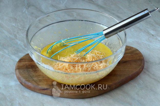 Твёрдый сыр также натрите на тёрке и добавьте в миску.