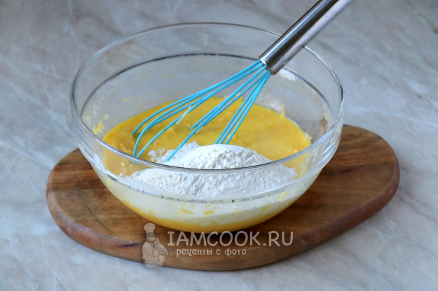Введите просеянную пшеничную муку, смешанную с разрыхлителем.