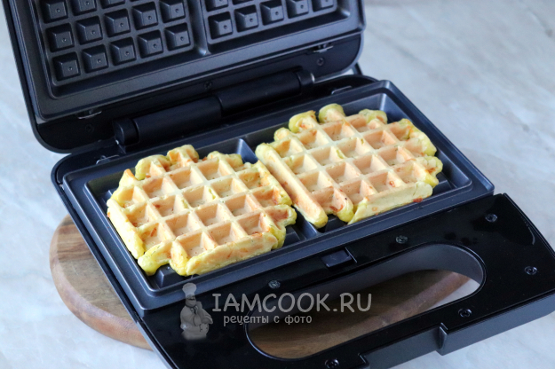 Закройте вафельницу и выпекайте вафли в течение 7 минут до золотистости. Точное время приготовления будет зависеть только от вашего прибора, ориентируйтесь по цвету.
