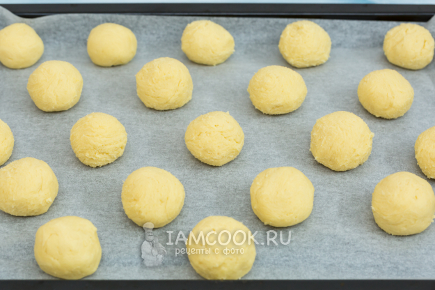 Из теста сформируйте шарики размером с грецкий орех и выложите заготовки на противень, застеленный пергаментом.