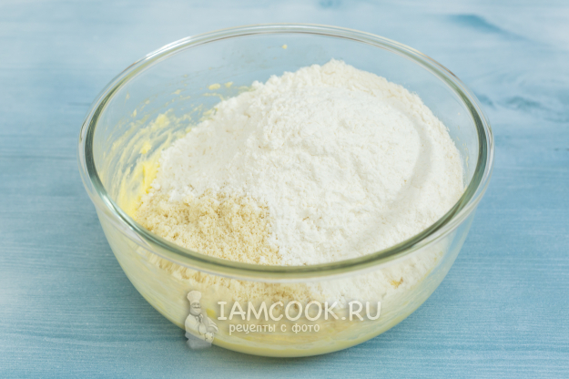 Добавьте оба вида муки и разрыхлитель.