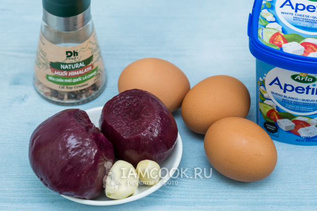 Для приготовления свекольного паштета с сыром фета и яйцами подготовьте продукты по списку.