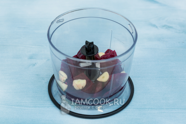 В блендер выложите нарезанные грубо свеклу и чеснок.