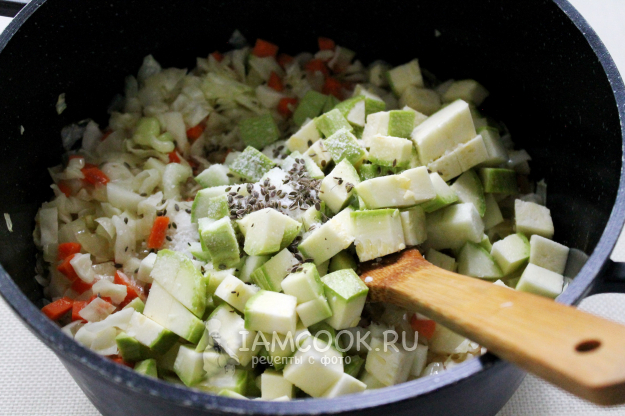 Последним из овощей в казан добавляем нарезанный кабачок, солим, кладем семена укропа (если любите эту пряность, можно заменить любой другой). Все перемешиваем и тушим до полуготовности, жидкости в начинке не будет при соблюдении этой технологии.