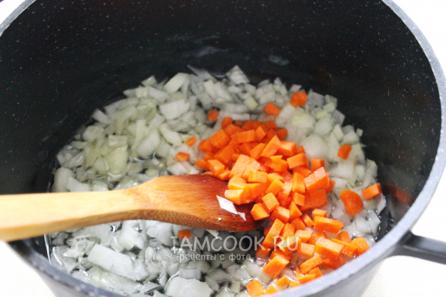 Следом за луком в казан отправляем морковь.