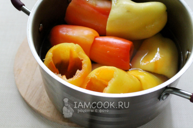 Бросим подготовленные перцы в кипяток, чуть подсолив его, побланшируем минуты 3 с момента закипания. Это сделает перцы мягче и податливее для укладывания начинки.