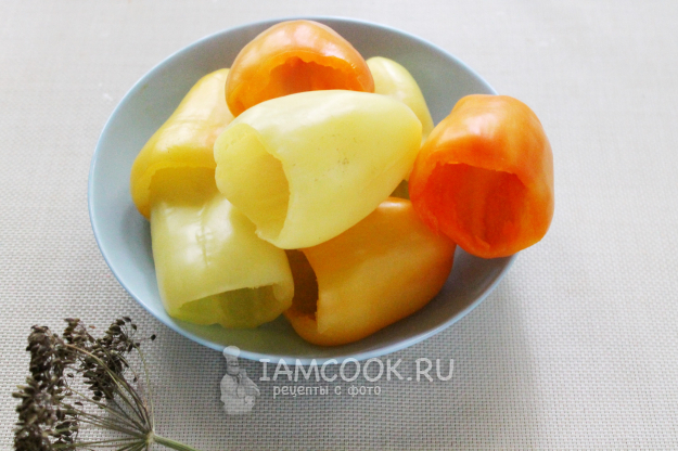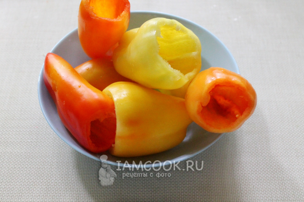 Сначала хорошо вымоем и очистим перцы от семенных коробочек, обрезав их по кругу со стороны хвостиков.