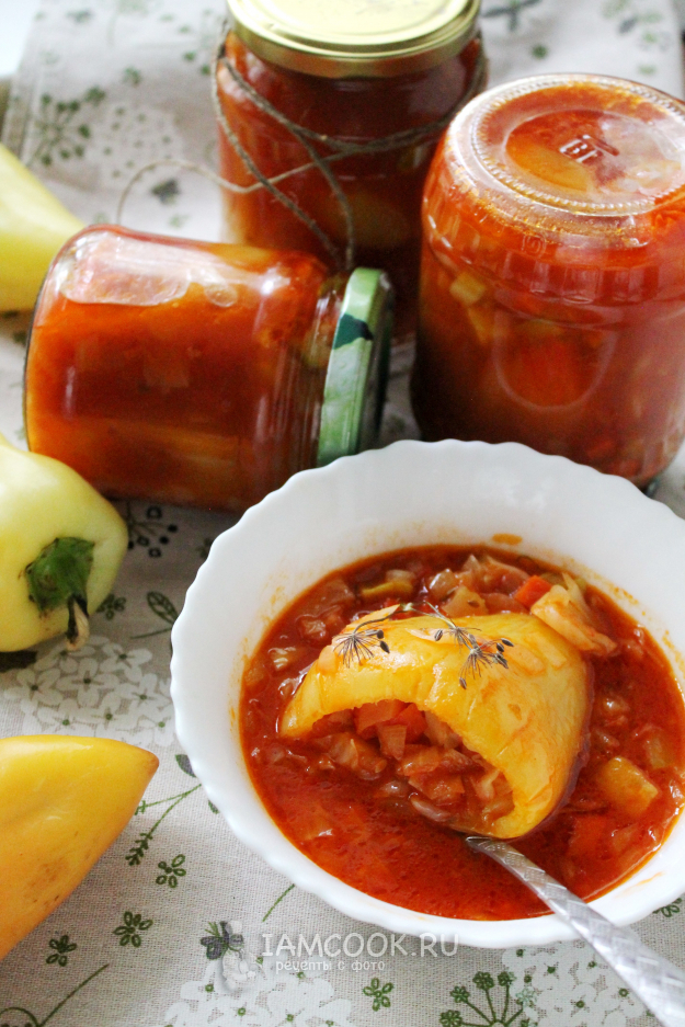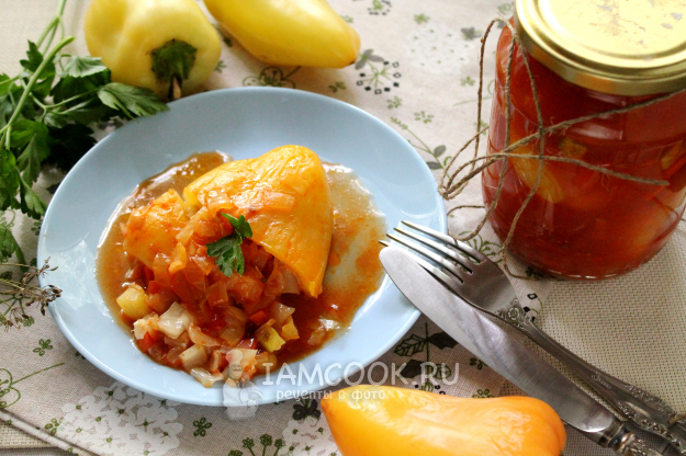 В стерильные банки укладываем кипящие перцы и заливаем томатной заливкой.