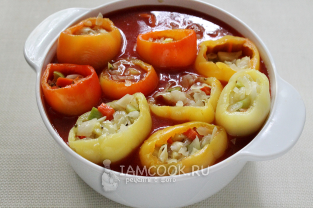 Перцы фаршируем, укладываем их в заливку и доводим до кипения, медленно кипятим заготовку минут 10, чтобы все компоненты успели прогреться одинаково.
