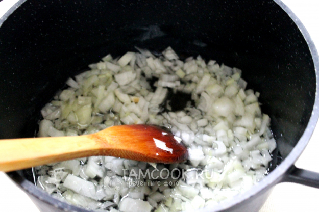 Разогреем подсолнечное масло и слегка поджарим в нем лук до прозрачности. Для приготовления идеально подходит казан или толстостенная кастрюля.