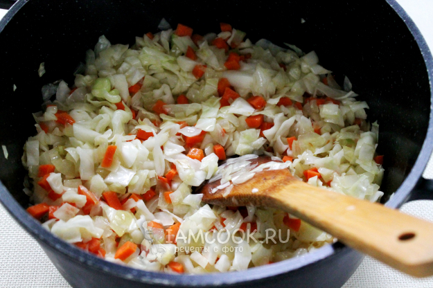 Белокочанную капусту нашинкуем и тоже добавим для обжарки.