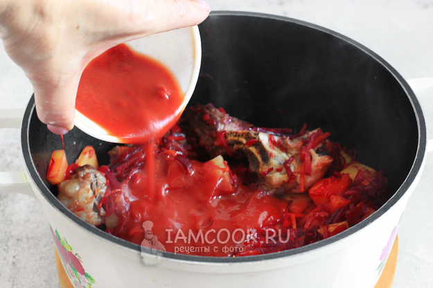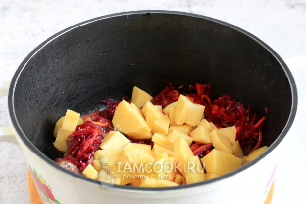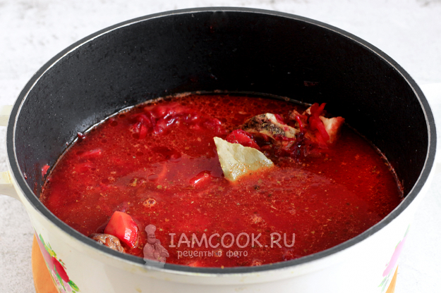 Затем влейте воду и добавьте лавровый лист. Учитывайте, что будет еще добавляться капуста, поэтому густоту борща регулируйте сами, по своему предпочтению. Я еще доливала воду, потому что мой муж не любит очень густой борщ. Здесь не мешает немного все подсолить. Варите борщ до мягкости картофеля.