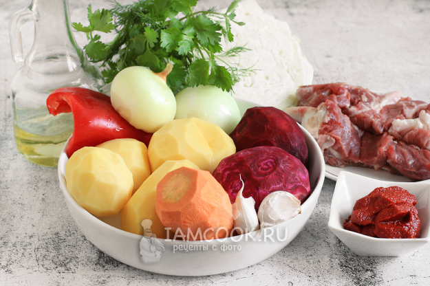 Чтобы приготовить жареный борщ в казане, подготовьте необходимые продукты по списку ингредиентов. Овощи предварительно вымойте и очистите.