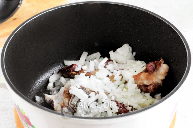 Затем мясо отделите от кости, нарежьте кусочками и отправьте снова в казан.