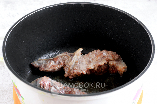 В казан добавьте растительное масло и хорошо его нагрейте. Затем обжарьте мясо до румяного цвета и хорошо посолите.