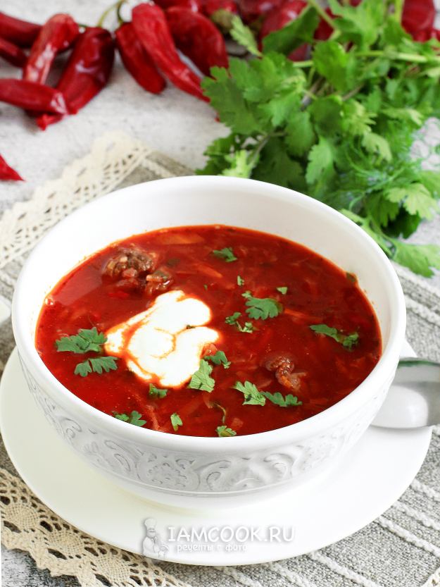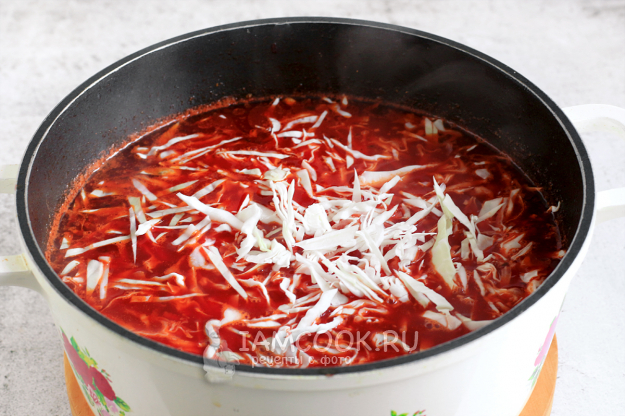 В последнюю очередь добавьте тонко нашинкованную капусту. В кисловатой среде она варится дольше, чем обычно. Если любите капусту сыроватой, то выключите огонь через пару минут. Если нужно, чтобы капуста вышла помягче, то поварите ее до предпочитаемой мягкости. Обязательно проверьте вкус борща на соль и кислинку, добавьте чего не хватает. Жареный борщ фактически готов.