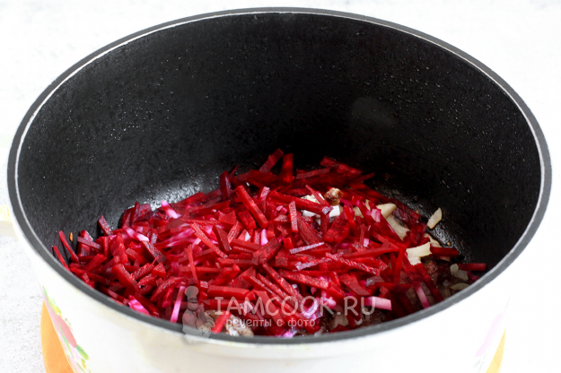 Добавьте нарезанную тонкой соломкой свеклу. Я обычно нарезаю ее вручную, не толще спички. Жарьте 10 минут при периодическом помешивании. Посолите и добавьте специи - кориандр, черный перец, хмели-сунели.