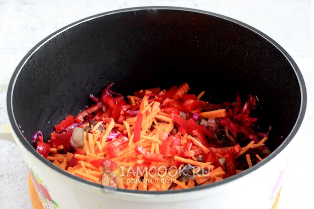 Далее черед моркови и болгарского перца. Добавьте их в казан и, помешивая, обжарьте еще 5-7 минут.