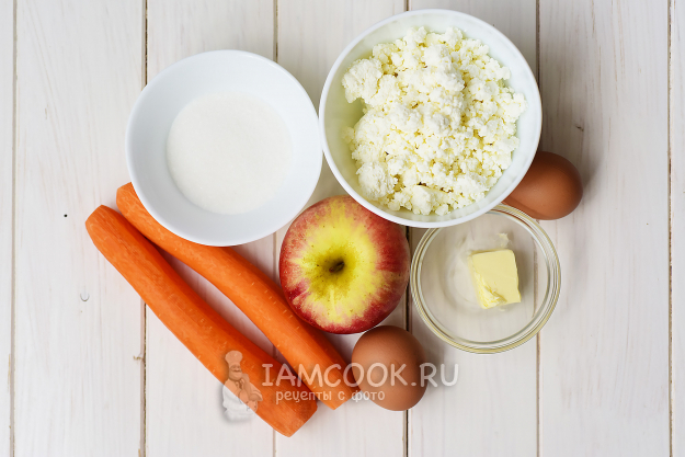 Возьмём необходимые ингредиенты для приготовления морковно-творожного пудинга в духовке. Морковь почистим и помоем. С яблока снимем кожуру и вырежем семенной отдел.
