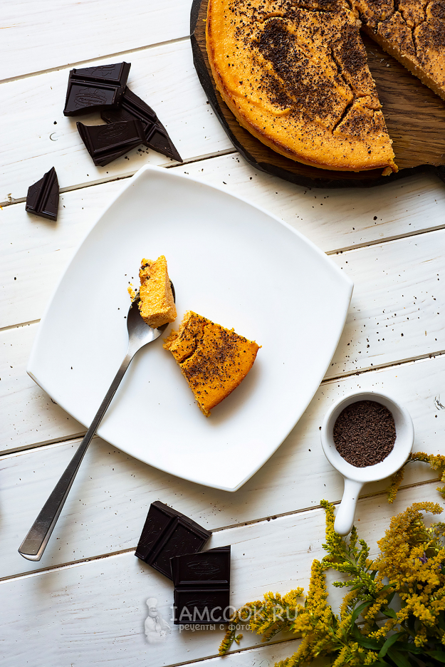 Готовый морковно-творожный пудинг охладим полностью, выложив на деревянную поверхность.